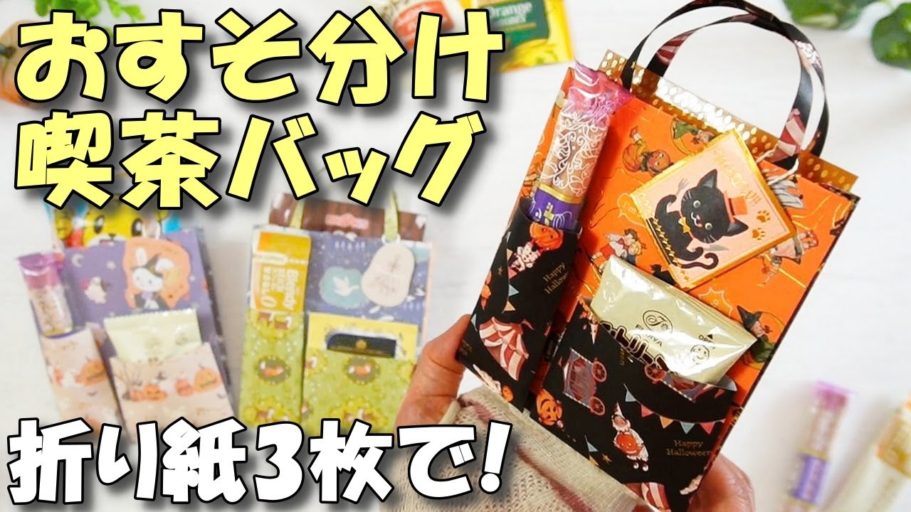 説明文折り紙で作るギフトバッグの作り方動画です。100均デザペ折り紙3枚で簡単な3ポケットおすそ分け喫茶バッグを手作りします。ハロウィンのお菓子やコーヒー、紅茶を詰めてかわいいプレゼントに。メインの手提げ袋...
