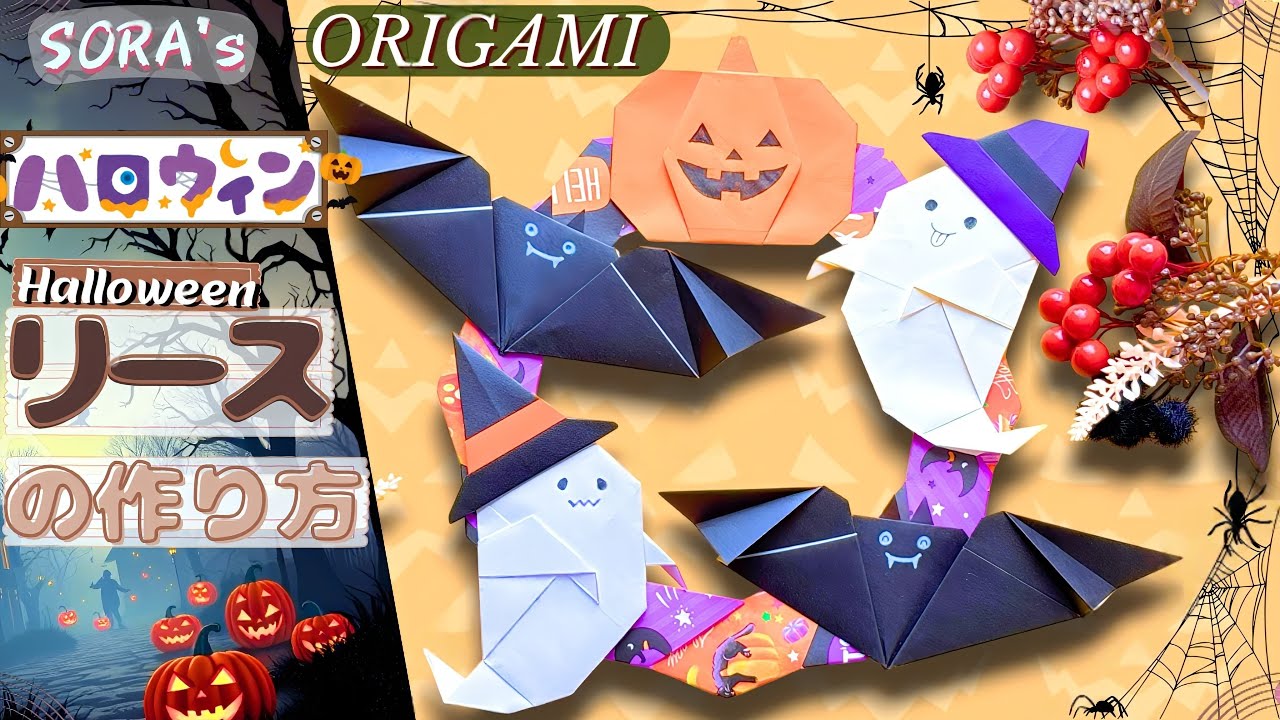 タイトル | 【ハロウィンの折り紙 リースの作り方】かぼちゃとおばけ、こうもり付きの飾り【ソラ】 |